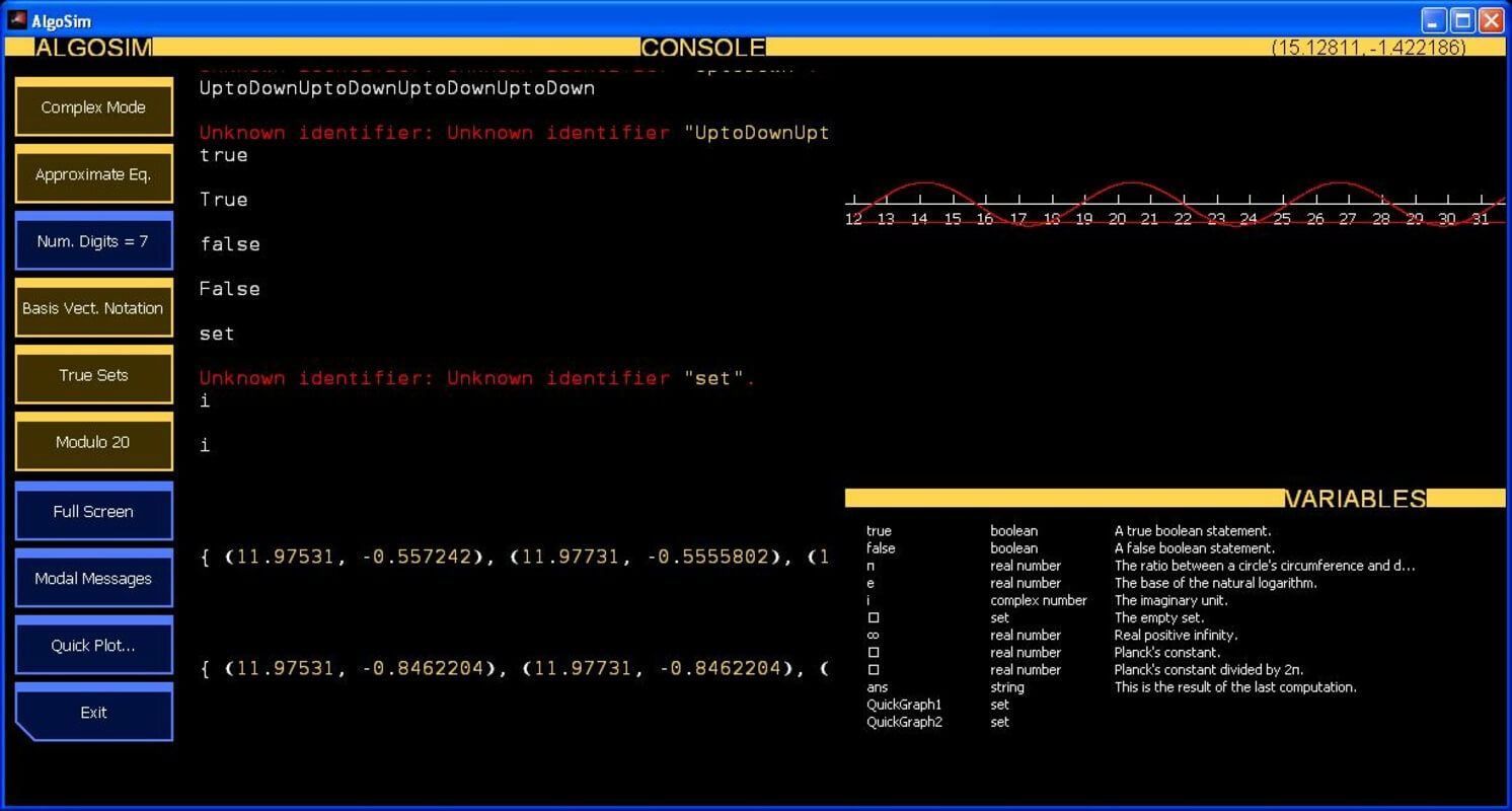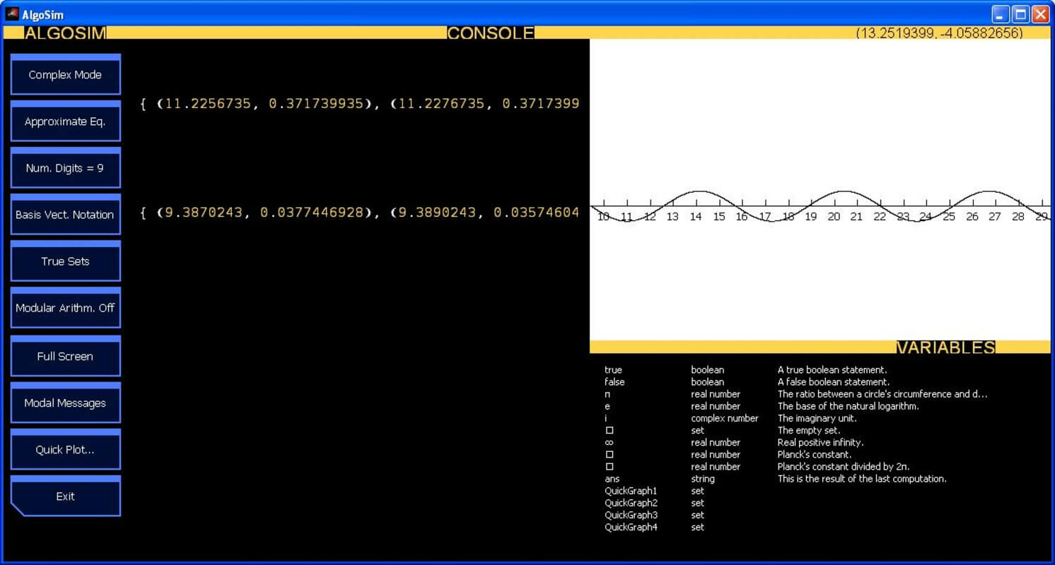 With over 800 functions and 70 operators at your disposal, AlgoSim offers an extensive array of mathematical tools covering a wide spectrum of areas, including linear algebra and number theory. Its syntax closely resembles ordinary mathematical notation, making it easy to work with. Additionally, AlgoSim treats functions as first-class objects, allowing for seamless manipulation and organization.